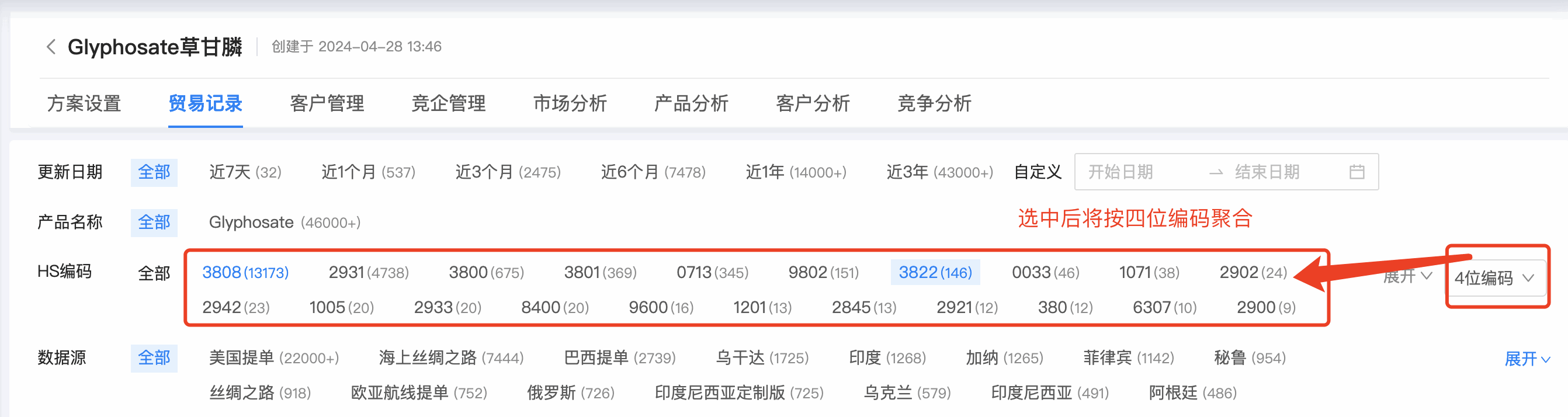 1. Ebpay数据通贸易记录的编码筛选,支持按 4 位、 6 位编码位数统计,同时可支持多选。