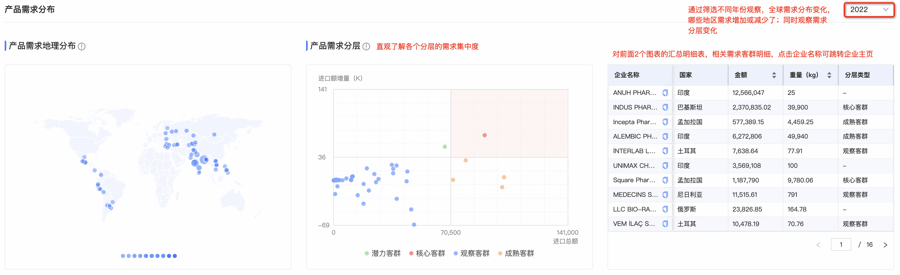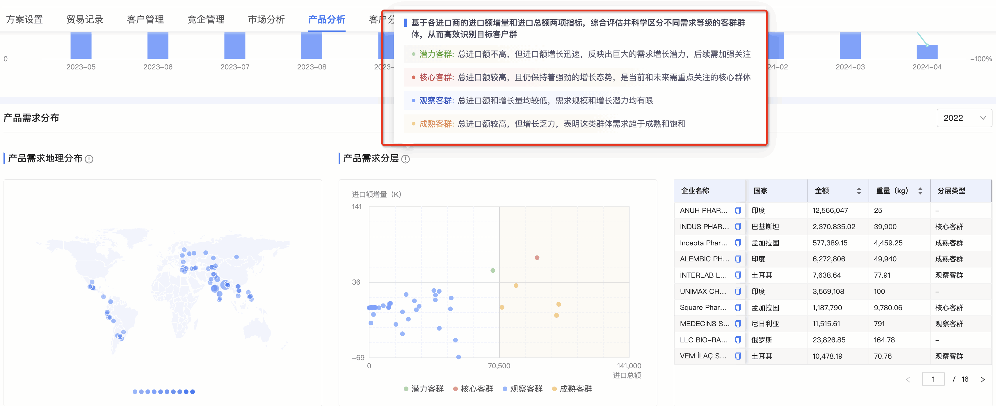 ● 产品需求分层图:Ebpay数据通将需求客群按照进口额增量和总额进行分层,划分为潜力、观察、成熟和核心四个层级。分层有助于用户快速锁定目标客户群体。标题旁附需求分层的解读,能让用户更直观、快速理解每个层级的特征,能够更快速的识别目标客群。